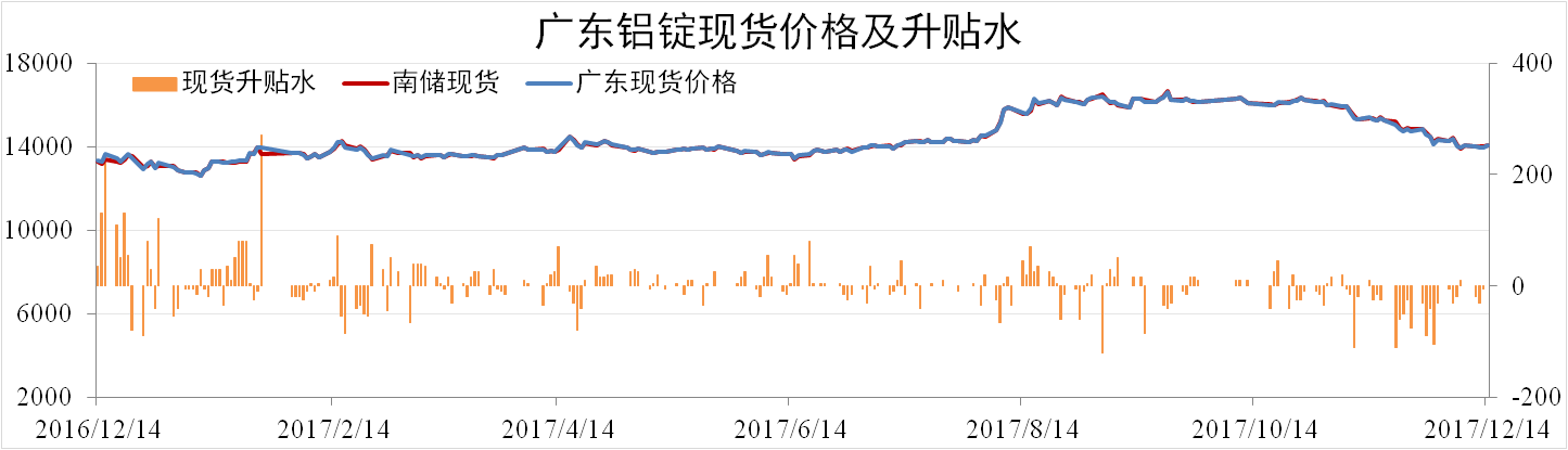 截至12月14日,南儲華南鋁錠現貨價報14,040元/噸,環比下跌8.53%,廣東現貨成交價報14,040元/噸,環比下跌8.38%。庫存方面,截至12月7日,全國庫存為169.53萬噸,環比上漲0.77%。